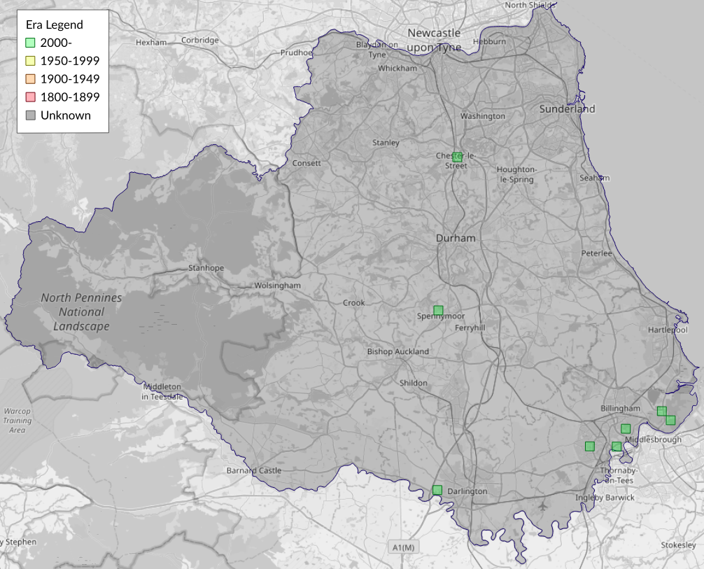 This map shows all records of - Eucosma conterminana in the Durham (VC66) database per monad (1km grid square). The map can be explored further by zooming and panning, can be reset using the button on the left, and can be filtered by selecting the era. Click on a monad to view a full list of species recorded in it, or its containing hexad (10km grid square).