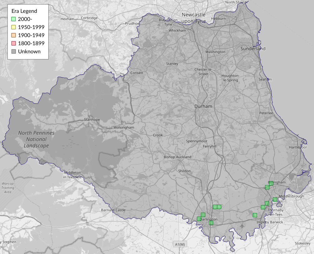 This map shows all records of - Lozotaeniodes formosana in the Durham (VC66) database per monad (1km grid square). The map can be explored further by zooming and panning, can be reset using the button on the left, and can be filtered by selecting the era. Click on a monad to view a full list of species recorded in it, or its containing hexad (10km grid square).