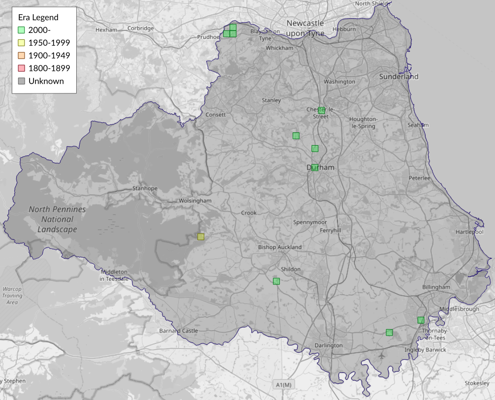 This map shows all records of - Pammene giganteana in the Durham (VC66) database per monad (1km grid square). The map can be explored further by zooming and panning, can be reset using the button on the left, and can be filtered by selecting the era. Click on a monad to view a full list of species recorded in it, or its containing hexad (10km grid square).