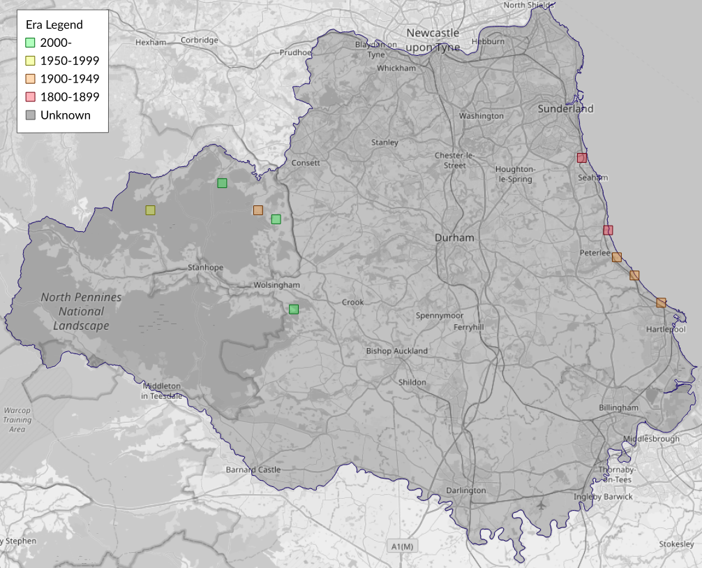 This map shows all records of - Philedonides lunana in the Durham (VC66) database per monad (1km grid square). The map can be explored further by zooming and panning, can be reset using the button on the left, and can be filtered by selecting the era. Click on a monad to view a full list of species recorded in it, or its containing hexad (10km grid square).