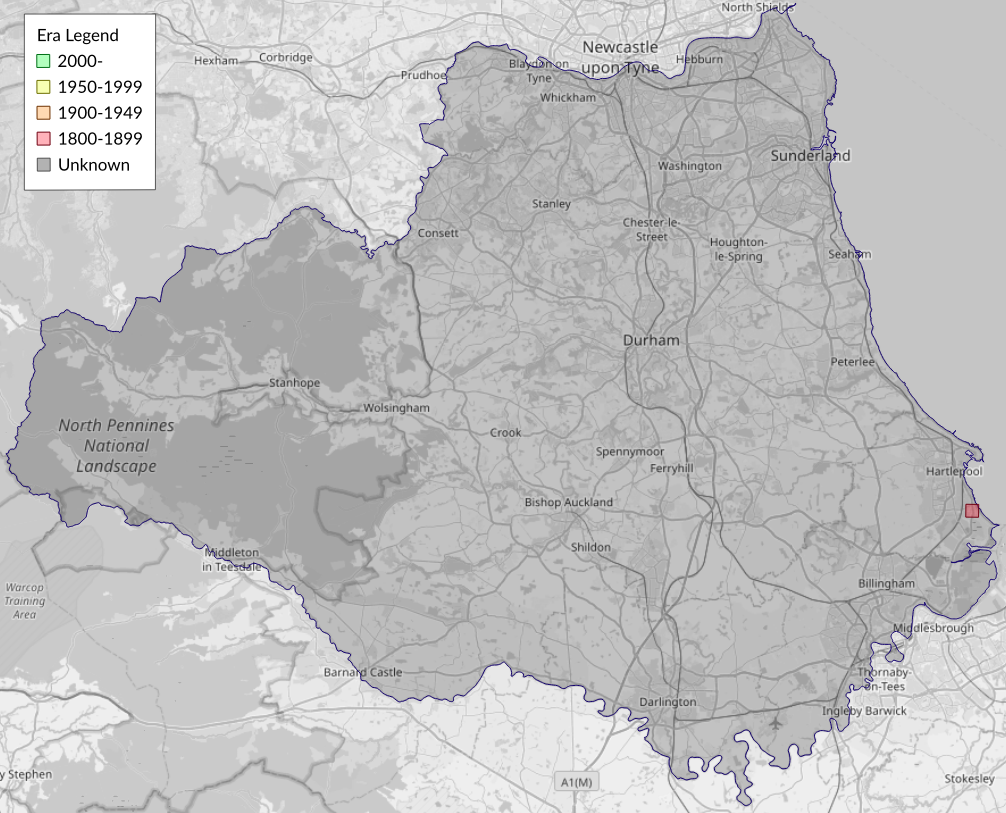 This map shows all records of - Phtheochroa inopiana in the Durham (VC66) database per monad (1km grid square). The map can be explored further by zooming and panning, can be reset using the button on the left, and can be filtered by selecting the era. Click on a monad to view a full list of species recorded in it, or its containing hexad (10km grid square).