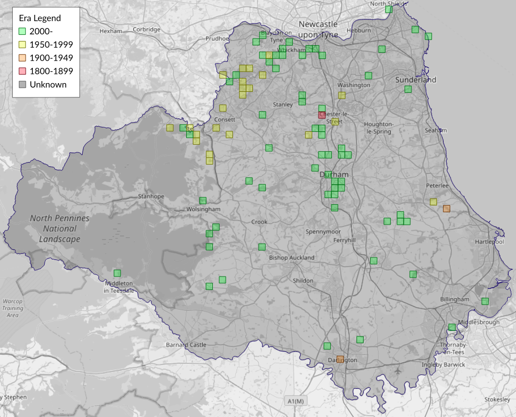 This map shows all records of - Adela reaumurella in the Durham (VC66) database per monad (1km grid square). The map can be explored further by zooming and panning, can be reset using the button on the left, and can be filtered by selecting the era. Click on a monad to view a full list of species recorded in it, or its containing hexad (10km grid square).