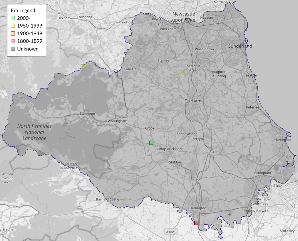 This map shows all records of - Bucculatrix cidarella in the Durham (VC66) database per monad (1km grid square). The map can be explored further by zooming and panning, can be reset using the button on the left, and can be filtered by selecting the era. Click on a monad to view a full list of species recorded in it, or its containing hexad (10km grid square).