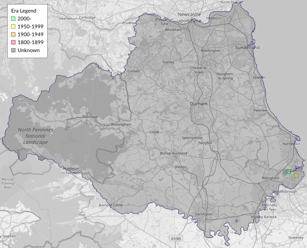 This map shows all records of - Bucculatrix maritima in the Durham (VC66) database per monad (1km grid square). The map can be explored further by zooming and panning, can be reset using the button on the left, and can be filtered by selecting the era. Click on a monad to view a full list of species recorded in it, or its containing hexad (10km grid square).