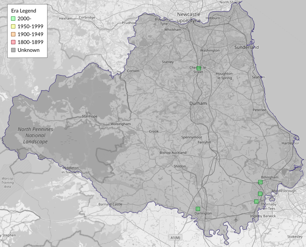 This map shows all records of - Bucculatrix thoracella in the Durham (VC66) database per monad (1km grid square). The map can be explored further by zooming and panning, can be reset using the button on the left, and can be filtered by selecting the era. Click on a monad to view a full list of species recorded in it, or its containing hexad (10km grid square).