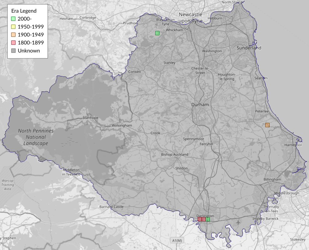 This map shows all records of - Coleophora albitarsella in the Durham (VC66) database per monad (1km grid square). The map can be explored further by zooming and panning, can be reset using the button on the left, and can be filtered by selecting the era. Click on a monad to view a full list of species recorded in it, or its containing hexad (10km grid square).