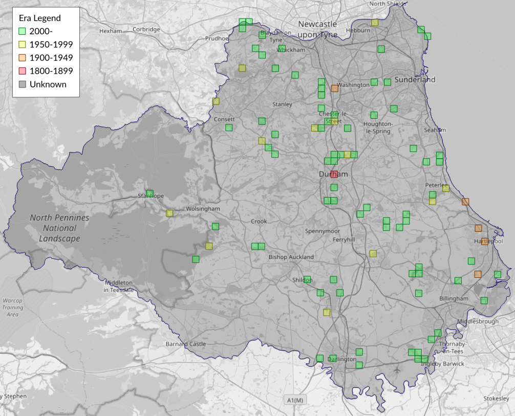 This map shows all records of Brown China-mark - Elophila nymphaeata in the Durham (VC66) database per monad (1km grid square). The map can be explored further by zooming and panning, can be reset using the button on the left, and can be filtered by selecting the era. Click on a monad to view a full list of species recorded in it, or its containing hexad (10km grid square).