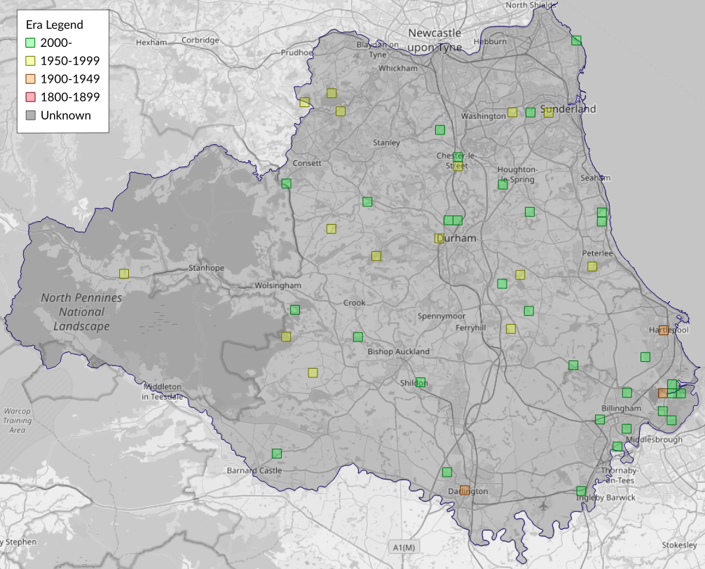 This map shows all records of - Scoparia subfusca in the Durham (VC66) database per monad (1km grid square). The map can be explored further by zooming and panning, can be reset using the button on the left, and can be filtered by selecting the era. Click on a monad to view a full list of species recorded in it, or its containing hexad (10km grid square).