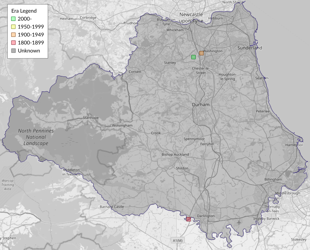 This map shows all records of - Depressaria sordidatella in the Durham (VC66) database per monad (1km grid square). The map can be explored further by zooming and panning, can be reset using the button on the left, and can be filtered by selecting the era. Click on a monad to view a full list of species recorded in it, or its containing hexad (10km grid square).