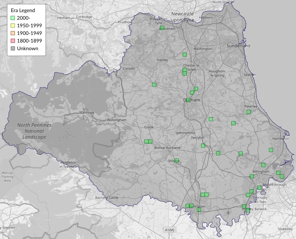 This map shows all records of Beautiful Hook-tip - Laspeyria flexula in the Durham (VC66) database per monad (1km grid square). The map can be explored further by zooming and panning, can be reset using the button on the left, and can be filtered by selecting the era. Click on a monad to view a full list of species recorded in it, or its containing hexad (10km grid square).