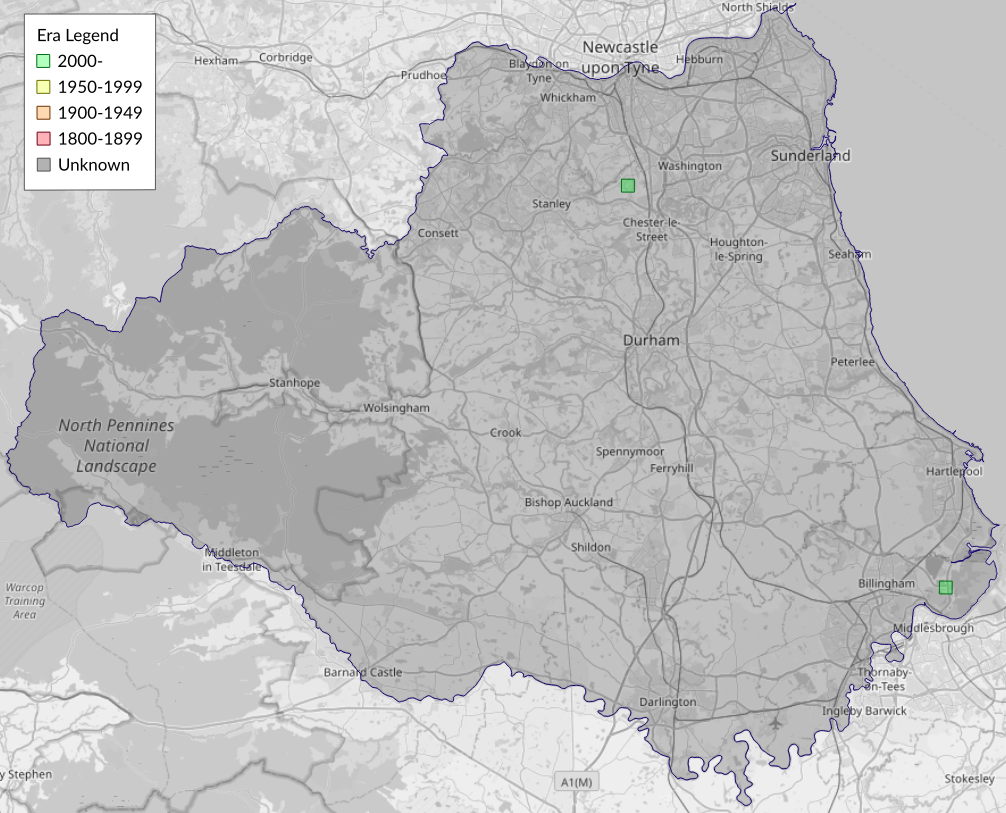 This map shows all records of Waved Black - Parascotia fuliginaria in the Durham (VC66) database per monad (1km grid square). The map can be explored further by zooming and panning, can be reset using the button on the left, and can be filtered by selecting the era. Click on a monad to view a full list of species recorded in it, or its containing hexad (10km grid square).