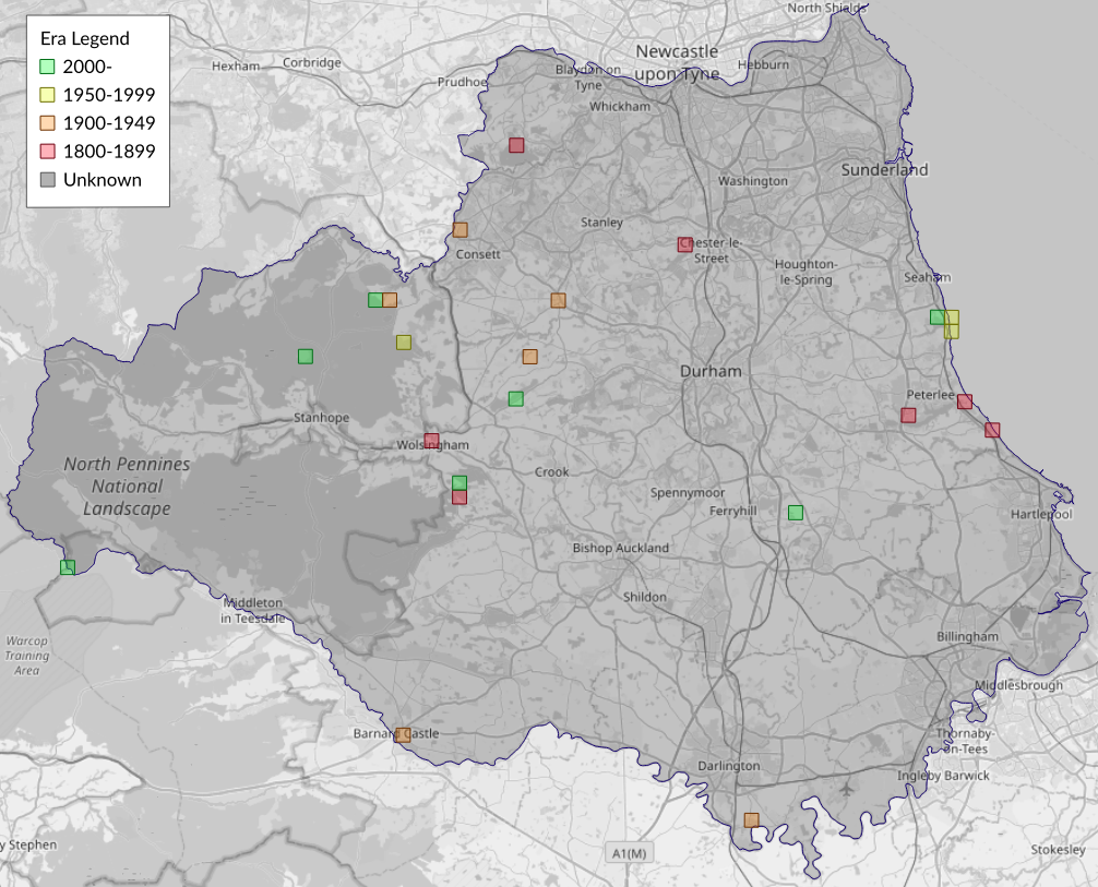 This map shows all records of Small Purple-barred - Phytometra viridaria in the Durham (VC66) database per monad (1km grid square). The map can be explored further by zooming and panning, can be reset using the button on the left, and can be filtered by selecting the era. Click on a monad to view a full list of species recorded in it, or its containing hexad (10km grid square).