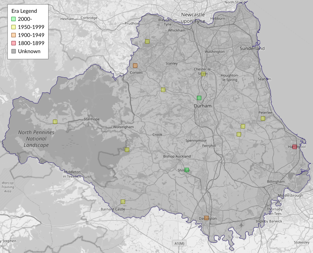 This map shows all records of - Acompsia cinerella in the Durham (VC66) database per monad (1km grid square). The map can be explored further by zooming and panning, can be reset using the button on the left, and can be filtered by selecting the era. Click on a monad to view a full list of species recorded in it, or its containing hexad (10km grid square).