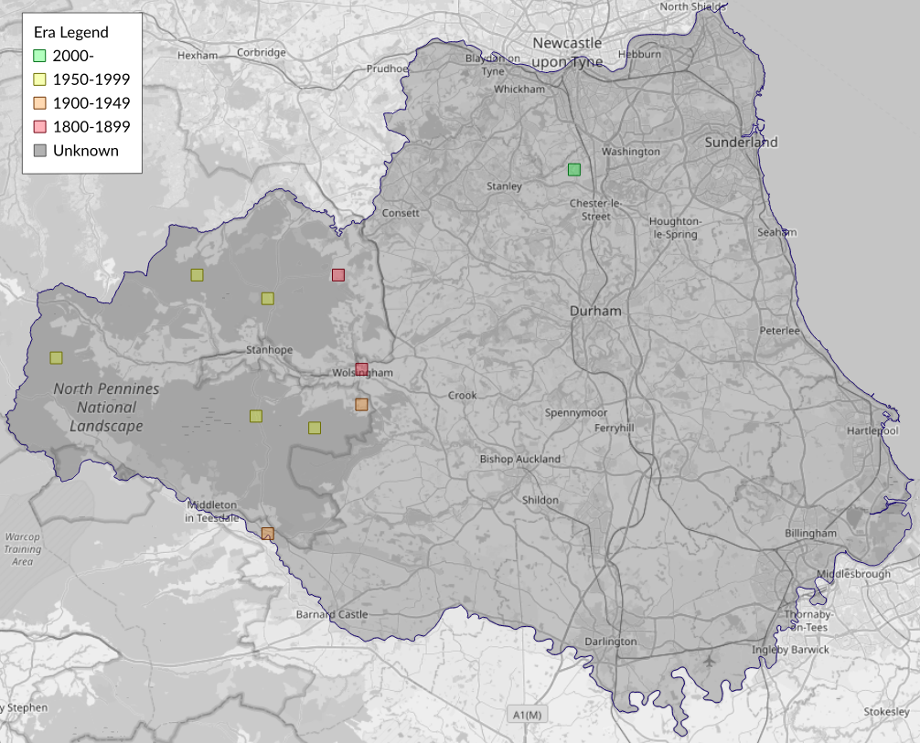 This map shows all records of - Xenolechia aethiops in the Durham (VC66) database per monad (1km grid square). The map can be explored further by zooming and panning, can be reset using the button on the left, and can be filtered by selecting the era. Click on a monad to view a full list of species recorded in it, or its containing hexad (10km grid square).