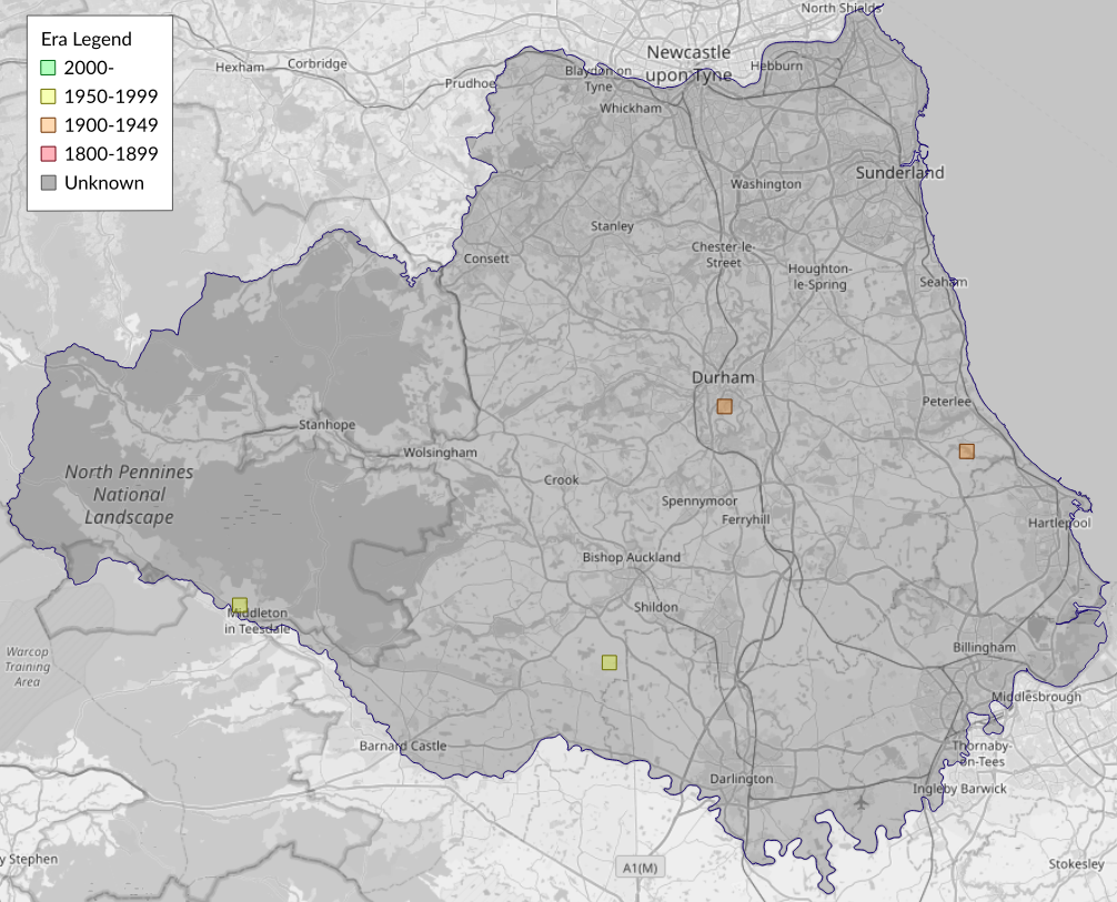 This map shows all records of Wood Carpet - Epirrhoe rivata in the Durham (VC66) database per monad (1km grid square). The map can be explored further by zooming and panning, can be reset using the button on the left, and can be filtered by selecting the era. Click on a monad to view a full list of species recorded in it, or its containing hexad (10km grid square).