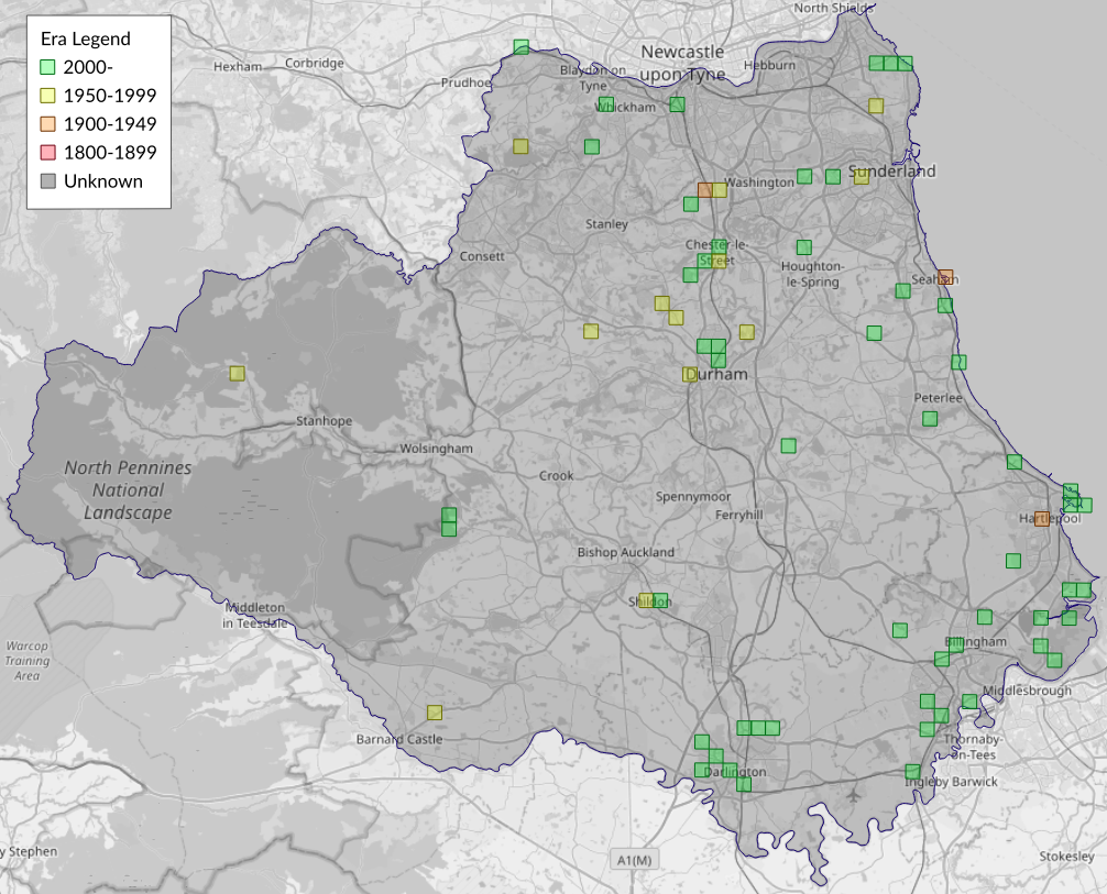 This map shows all records of Toadflax Pug - Eupithecia linariata in the Durham (VC66) database per monad (1km grid square). The map can be explored further by zooming and panning, can be reset using the button on the left, and can be filtered by selecting the era. Click on a monad to view a full list of species recorded in it, or its containing hexad (10km grid square).