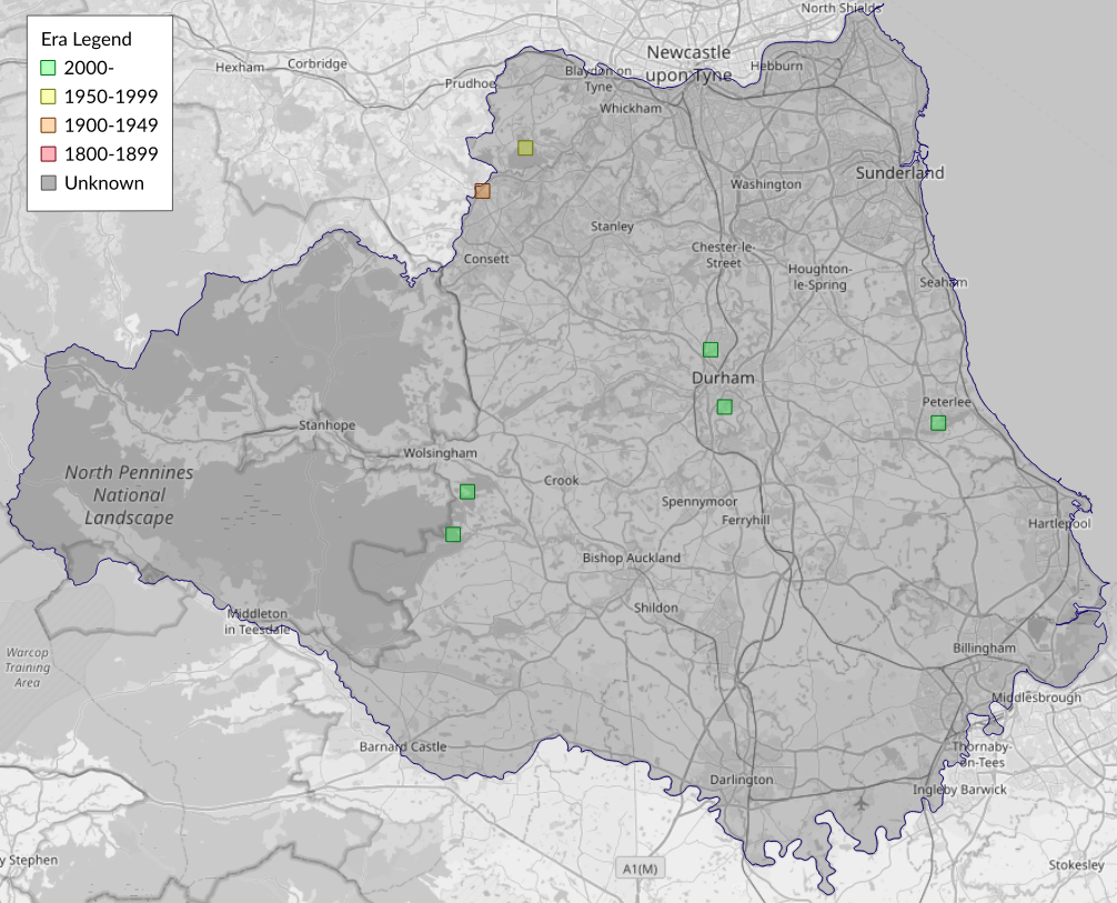 This map shows all records of Triple-spotted Pug - Eupithecia trisignaria in the Durham (VC66) database per monad (1km grid square). The map can be explored further by zooming and panning, can be reset using the button on the left, and can be filtered by selecting the era. Click on a monad to view a full list of species recorded in it, or its containing hexad (10km grid square).