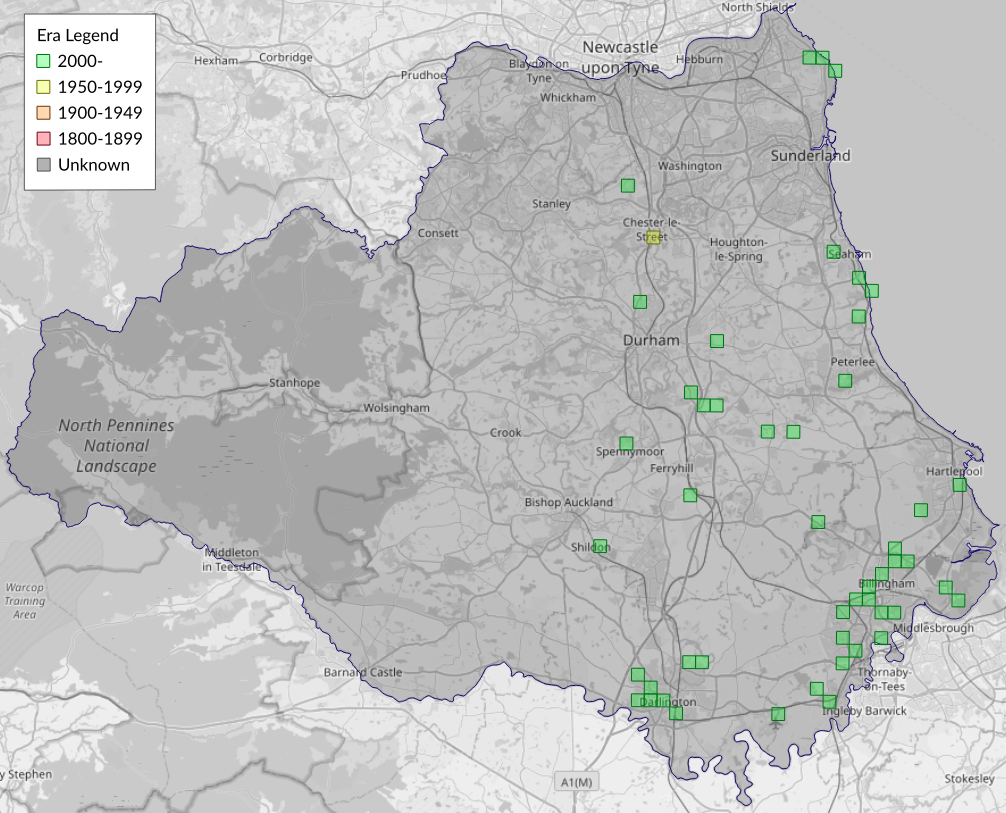 This map shows all records of Common Emerald - Hemithea aestivaria in the Durham (VC66) database per monad (1km grid square). The map can be explored further by zooming and panning, can be reset using the button on the left, and can be filtered by selecting the era. Click on a monad to view a full list of species recorded in it, or its containing hexad (10km grid square).