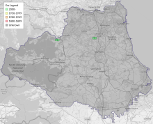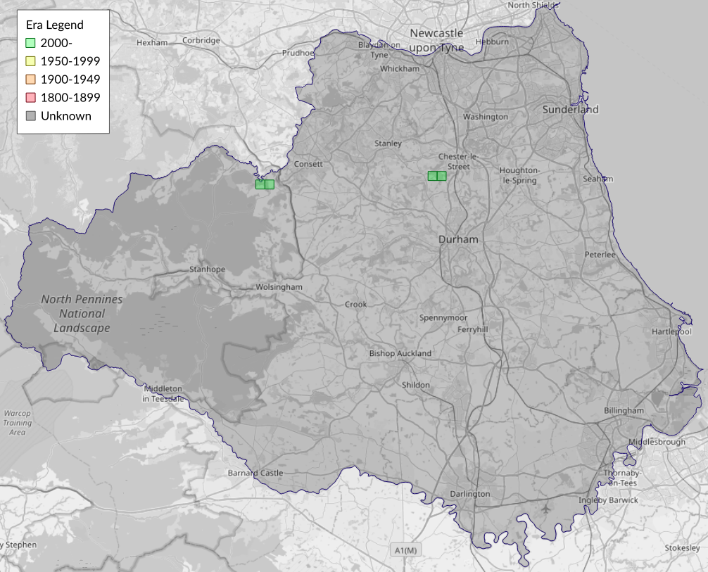 This map shows all records of Bilberry Pug - Pasiphila debiliata in the Durham (VC66) database per monad (1km grid square). The map can be explored further by zooming and panning, can be reset using the button on the left, and can be filtered by selecting the era. Click on a monad to view a full list of species recorded in it, or its containing hexad (10km grid square).