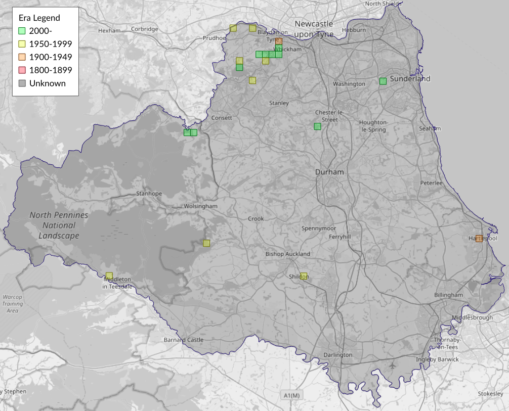 This map shows all records of Cream Wave - Scopula floslactata in the Durham (VC66) database per monad (1km grid square). The map can be explored further by zooming and panning, can be reset using the button on the left, and can be filtered by selecting the era. Click on a monad to view a full list of species recorded in it, or its containing hexad (10km grid square).