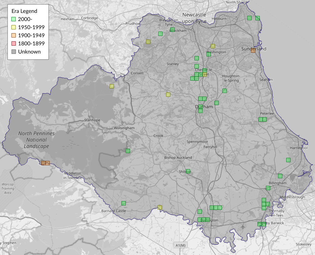 This map shows all records of Juniper Carpet - Thera juniperata in the Durham (VC66) database per monad (1km grid square). The map can be explored further by zooming and panning, can be reset using the button on the left, and can be filtered by selecting the era. Click on a monad to view a full list of species recorded in it, or its containing hexad (10km grid square).