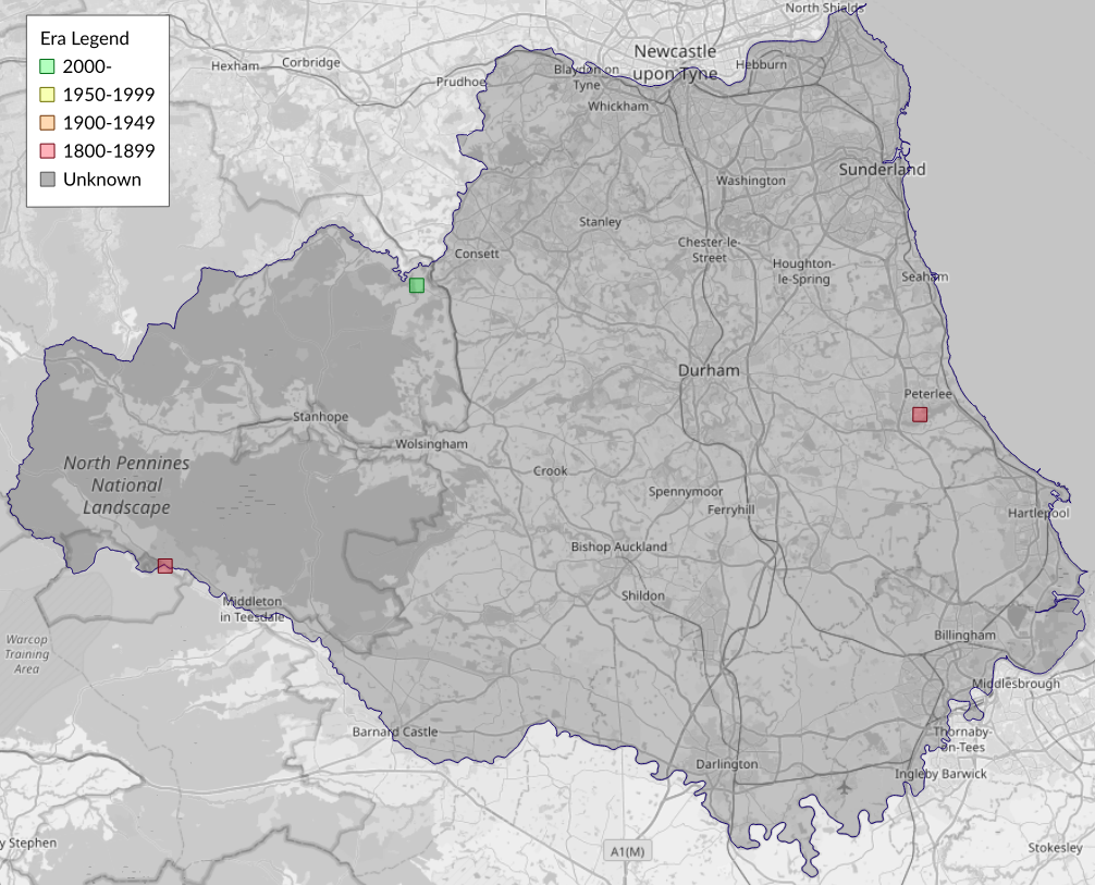 This map shows all records of - Acrolepiopsis betulella in the Durham (VC66) database per monad (1km grid square). The map can be explored further by zooming and panning, can be reset using the button on the left, and can be filtered by selecting the era. Click on a monad to view a full list of species recorded in it, or its containing hexad (10km grid square).