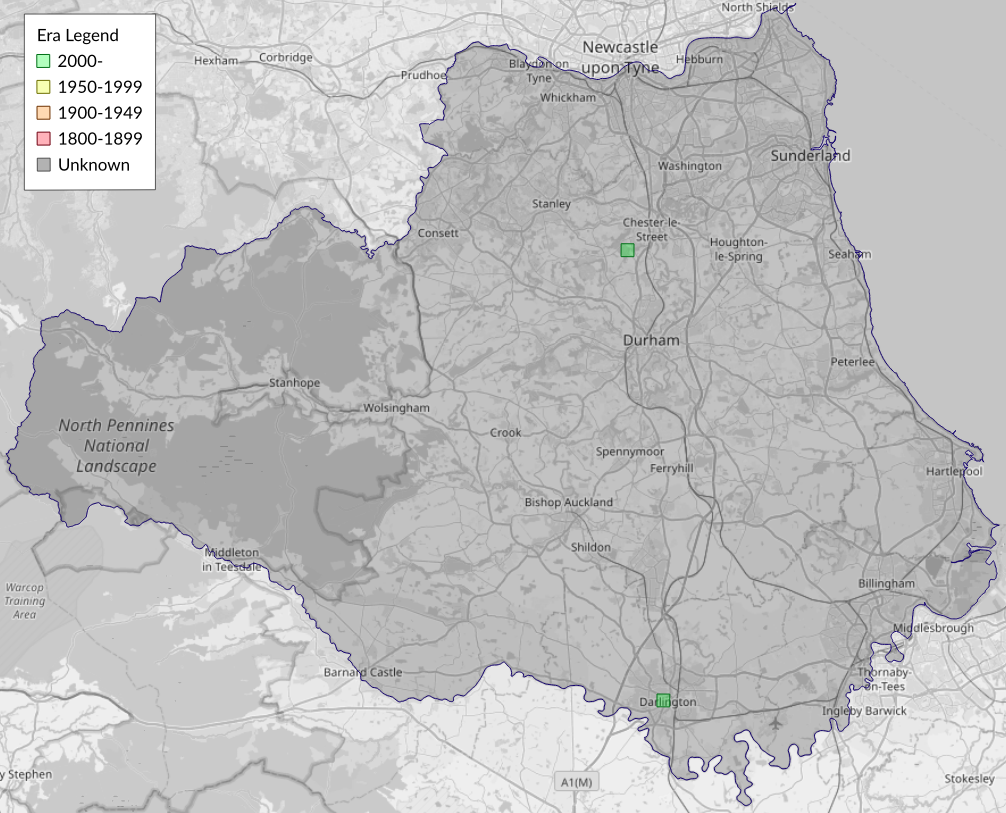 This map shows all records of - Acrocercops brongniardella in the Durham (VC66) database per monad (1km grid square). The map can be explored further by zooming and panning, can be reset using the button on the left, and can be filtered by selecting the era. Click on a monad to view a full list of species recorded in it, or its containing hexad (10km grid square).
