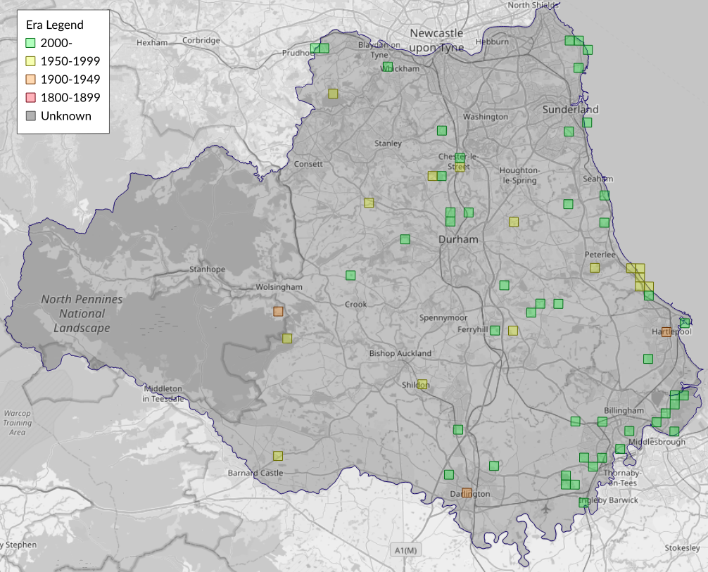 This map shows all records of - Aspilapteryx tringipennella in the Durham (VC66) database per monad (1km grid square). The map can be explored further by zooming and panning, can be reset using the button on the left, and can be filtered by selecting the era. Click on a monad to view a full list of species recorded in it, or its containing hexad (10km grid square).