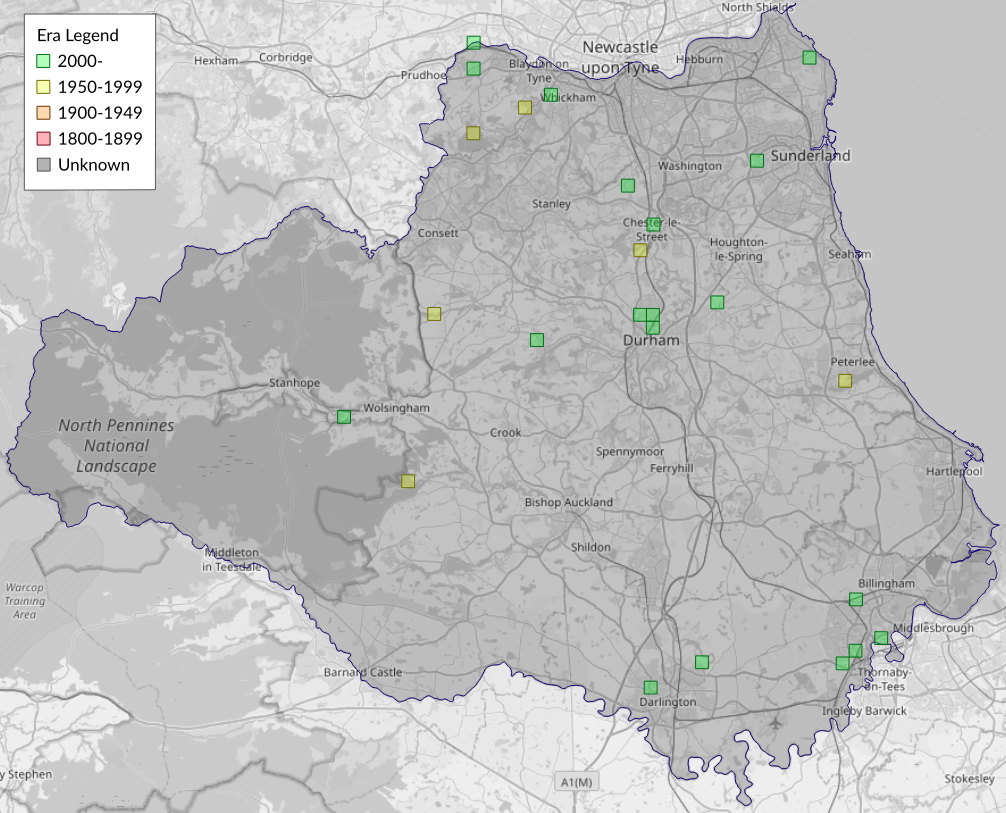 This map shows all records of - Caloptilia rufipennella in the Durham (VC66) database per monad (1km grid square). The map can be explored further by zooming and panning, can be reset using the button on the left, and can be filtered by selecting the era. Click on a monad to view a full list of species recorded in it, or its containing hexad (10km grid square).