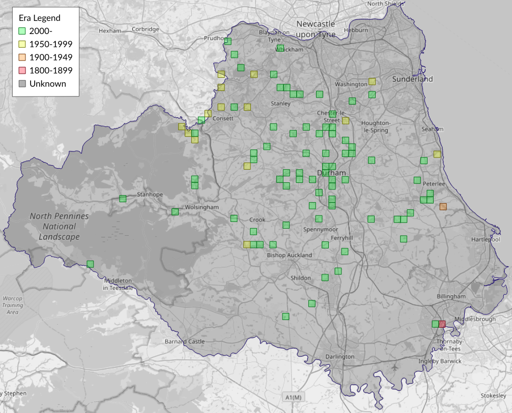 This map shows all records of - Phyllonorycter maestingella in the Durham (VC66) database per monad (1km grid square). The map can be explored further by zooming and panning, can be reset using the button on the left, and can be filtered by selecting the era. Click on a monad to view a full list of species recorded in it, or its containing hexad (10km grid square).