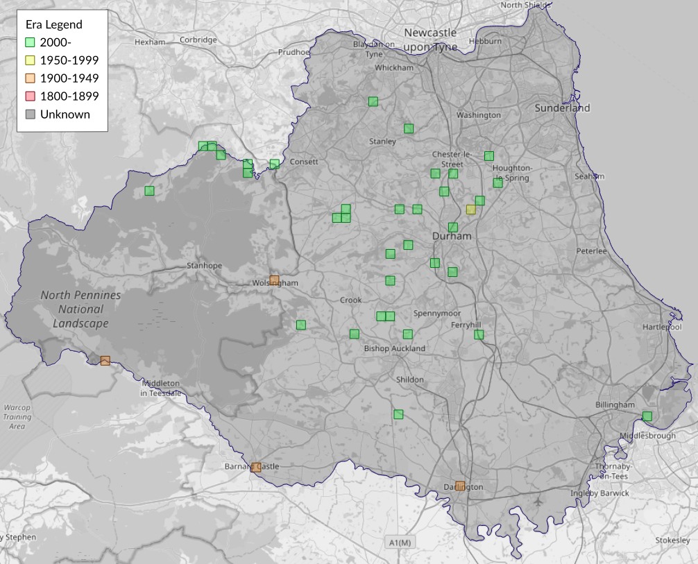 This map shows all records of - Ectoedemia occultella in the Durham (VC66) database per monad (1km grid square). The map can be explored further by zooming and panning, can be reset using the button on the left, and can be filtered by selecting the era. Click on a monad to view a full list of species recorded in it, or its containing hexad (10km grid square).