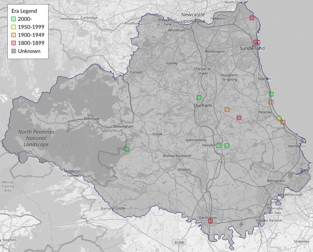 This map shows all records of Least Minor - Photedes captiuncula in the Durham (VC66) database per monad (1km grid square). The map can be explored further by zooming and panning, can be reset using the button on the left, and can be filtered by selecting the era. Click on a monad to view a full list of species recorded in it, or its containing hexad (10km grid square).