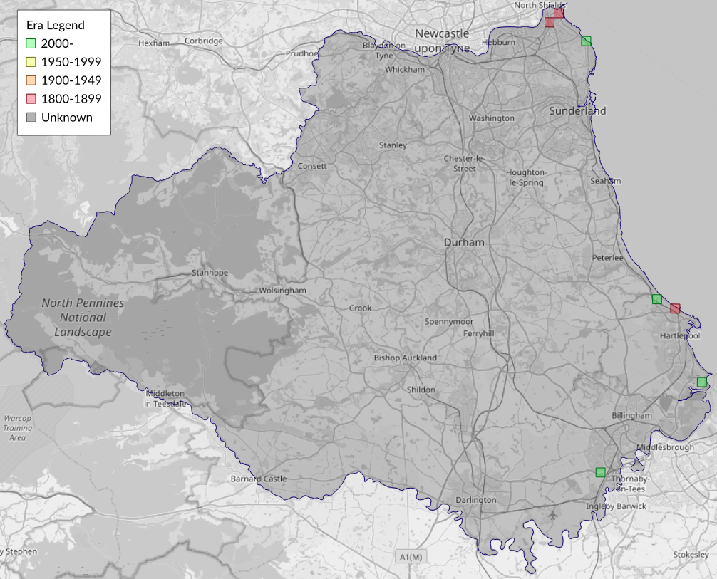 This map shows all records of White Colon - Sideridis turbida in the Durham (VC66) database per monad (1km grid square). The map can be explored further by zooming and panning, can be reset using the button on the left, and can be filtered by selecting the era. Click on a monad to view a full list of species recorded in it, or its containing hexad (10km grid square).