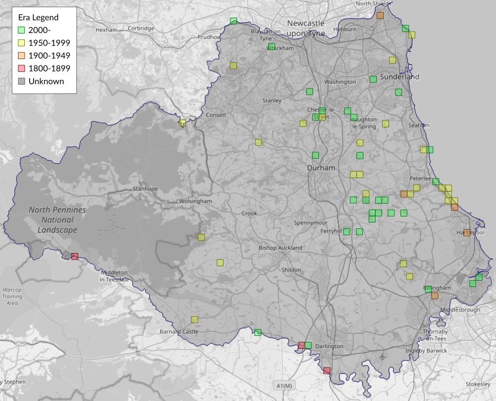 This map shows all records of Twin-spot Plume - Stenoptilia bipunctidactyla in the Durham (VC66) database per monad (1km grid square). The map can be explored further by zooming and panning, can be reset using the button on the left, and can be filtered by selecting the era. Click on a monad to view a full list of species recorded in it, or its containing hexad (10km grid square).
