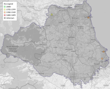 This map shows all records of Large Tabby - Aglossa pinguinalis in the Durham (VC66) database per monad (1km grid square). The map can be explored further by zooming and panning, can be reset using the button on the left, and can be filtered by selecting the era. Click on a monad to view a full list of species recorded in it, or its containing hexad (10km grid square).