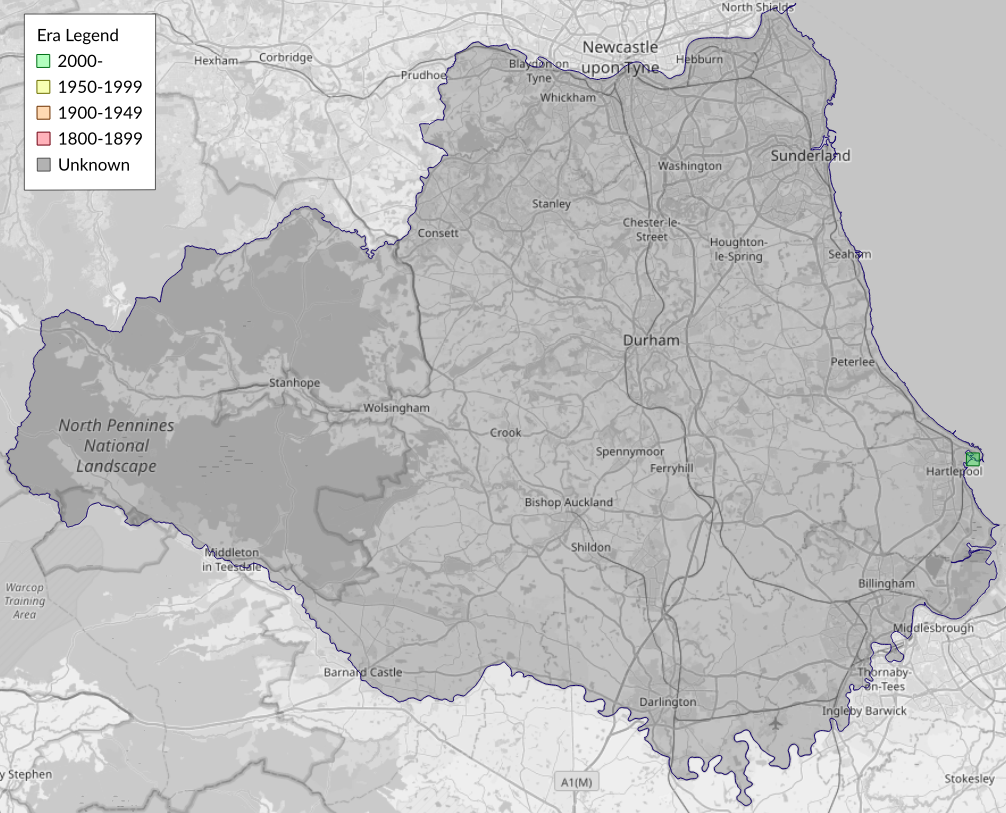 This map shows all records of Privet Hawk-moth - Sphinx ligustri in the Durham (VC66) database per monad (1km grid square). The map can be explored further by zooming and panning, can be reset using the button on the left, and can be filtered by selecting the era. Click on a monad to view a full list of species recorded in it, or its containing hexad (10km grid square).
