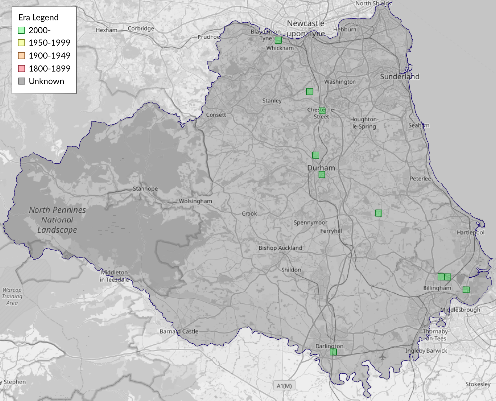 This map shows all records of - Stathmopoda pedella in the Durham (VC66) database per monad (1km grid square). The map can be explored further by zooming and panning, can be reset using the button on the left, and can be filtered by selecting the era. Click on a monad to view a full list of species recorded in it, or its containing hexad (10km grid square).