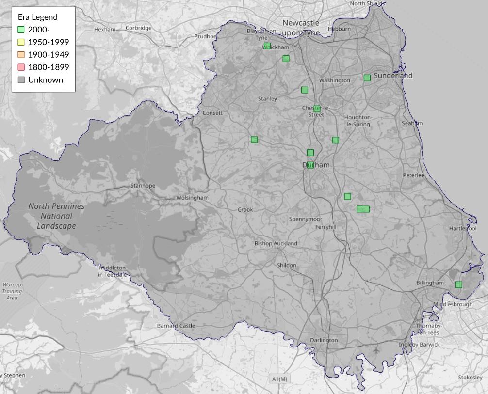 This map shows all records of - Acleris cristana in the Durham (VC66) database per monad (1km grid square). The map can be explored further by zooming and panning, can be reset using the button on the left, and can be filtered by selecting the era. Click on a monad to view a full list of species recorded in it, or its containing hexad (10km grid square).