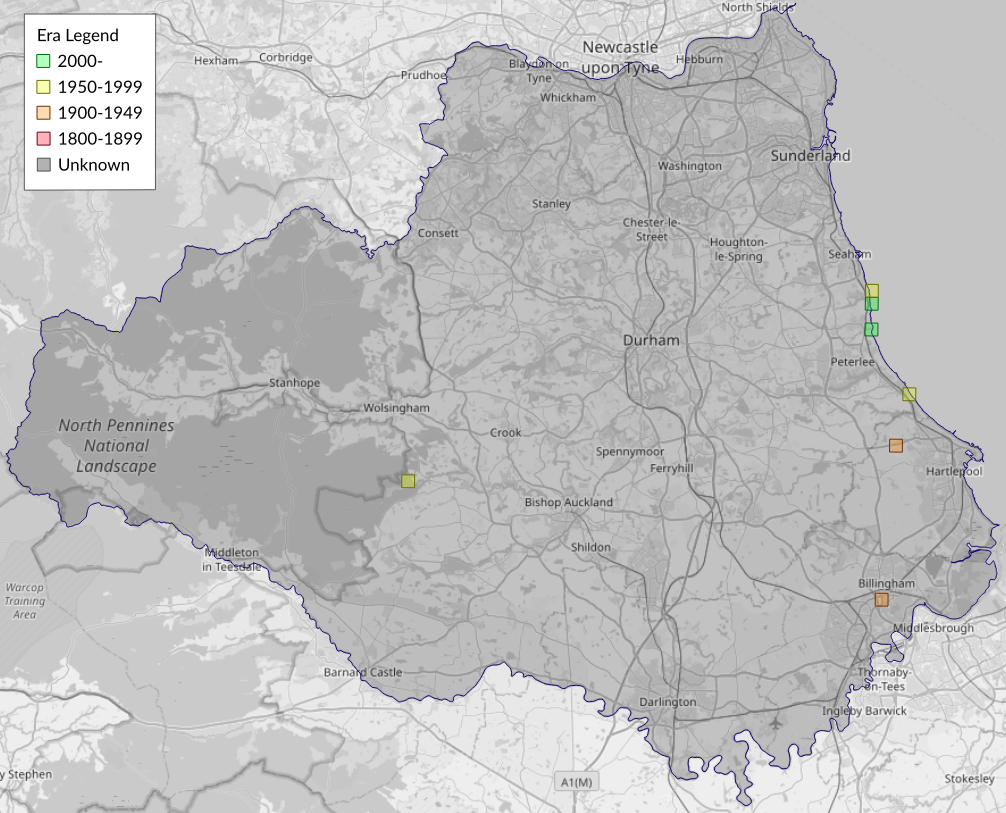 This map shows all records of - Aethes piercei in the Durham (VC66) database per monad (1km grid square). The map can be explored further by zooming and panning, can be reset using the button on the left, and can be filtered by selecting the era. Click on a monad to view a full list of species recorded in it, or its containing hexad (10km grid square).
