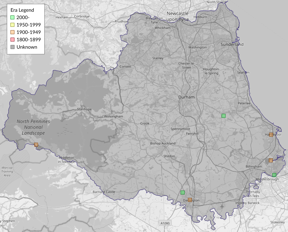 This map shows all records of - Dichrorampha plumbana in the Durham (VC66) database per monad (1km grid square). The map can be explored further by zooming and panning, can be reset using the button on the left, and can be filtered by selecting the era. Click on a monad to view a full list of species recorded in it, or its containing hexad (10km grid square).