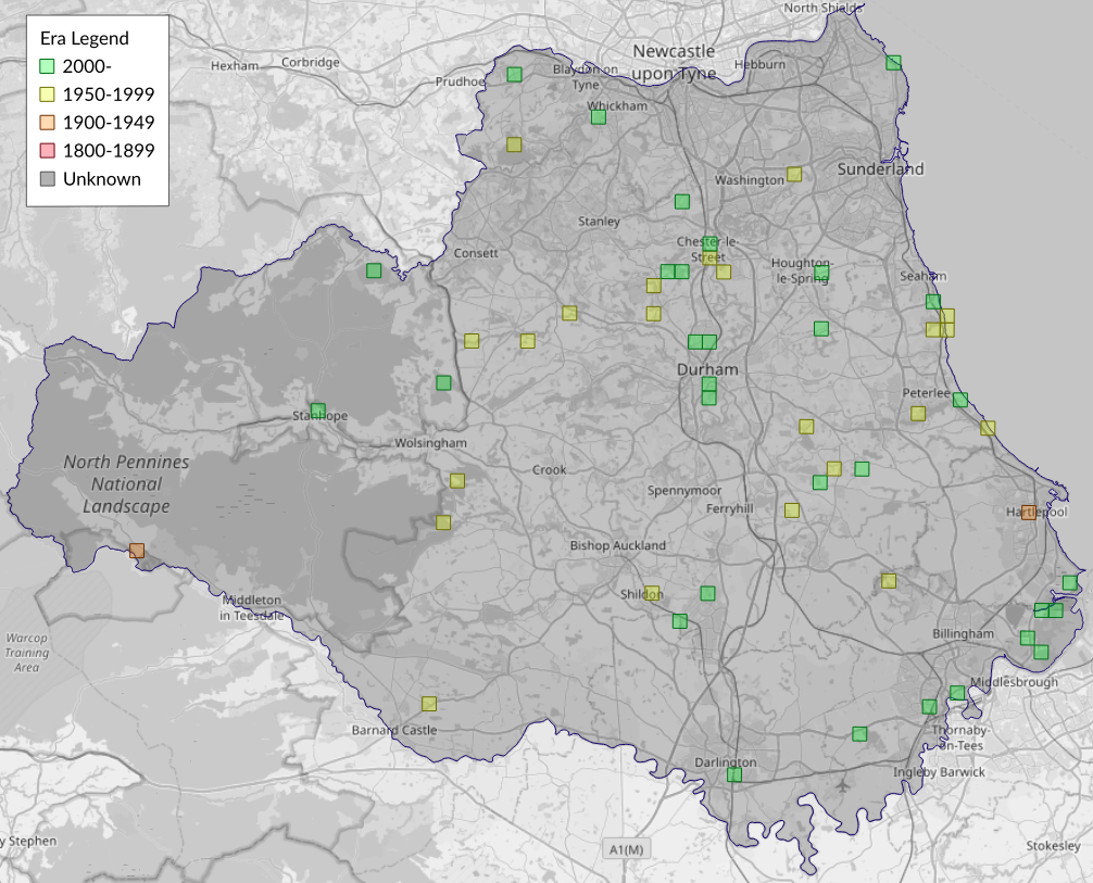 This map shows all records of - Eupoecilia angustana in the Durham (VC66) database per monad (1km grid square). The map can be explored further by zooming and panning, can be reset using the button on the left, and can be filtered by selecting the era. Click on a monad to view a full list of species recorded in it, or its containing hexad (10km grid square).
