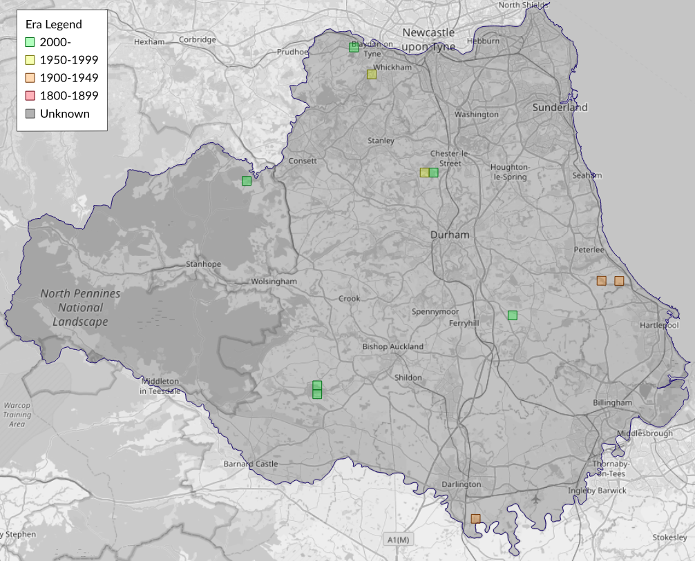 This map shows all records of - Grapholita internana in the Durham (VC66) database per monad (1km grid square). The map can be explored further by zooming and panning, can be reset using the button on the left, and can be filtered by selecting the era. Click on a monad to view a full list of species recorded in it, or its containing hexad (10km grid square).