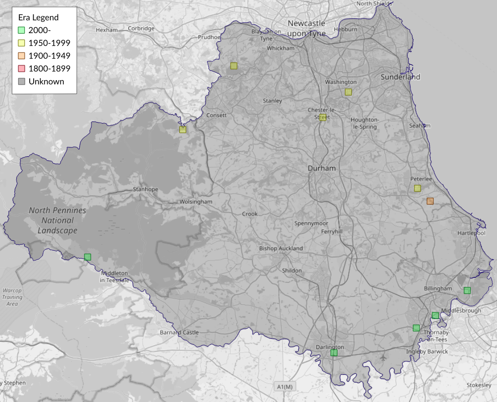 This map shows all records of - Ypsolopha vittella in the Durham (VC66) database per monad (1km grid square). The map can be explored further by zooming and panning, can be reset using the button on the left, and can be filtered by selecting the era. Click on a monad to view a full list of species recorded in it, or its containing hexad (10km grid square).