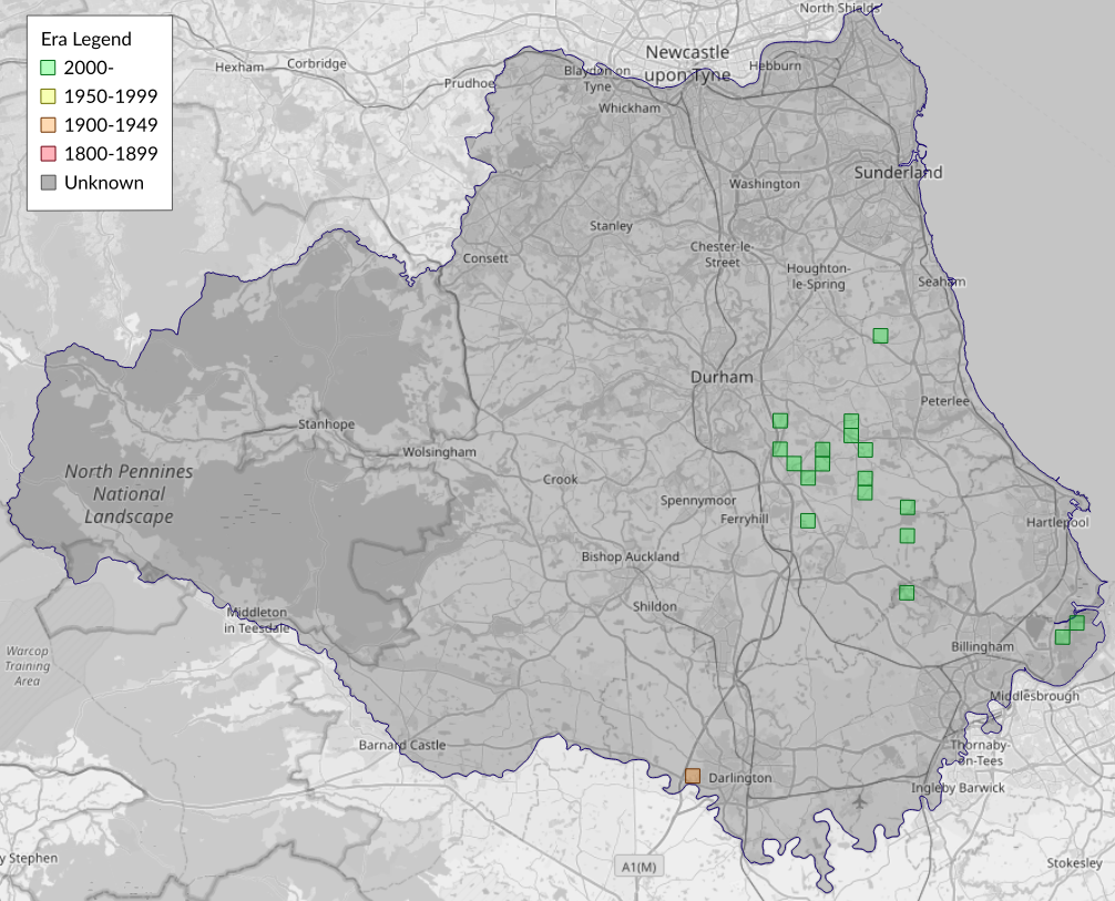 This map shows all records of - Coleophora striatipennella in the Durham (VC66) database per monad (1km grid square). The map can be explored further by zooming and panning, can be reset using the button on the left, and can be filtered by selecting the era. Click on a monad to view a full list of species recorded in it, or its containing hexad (10km grid square).