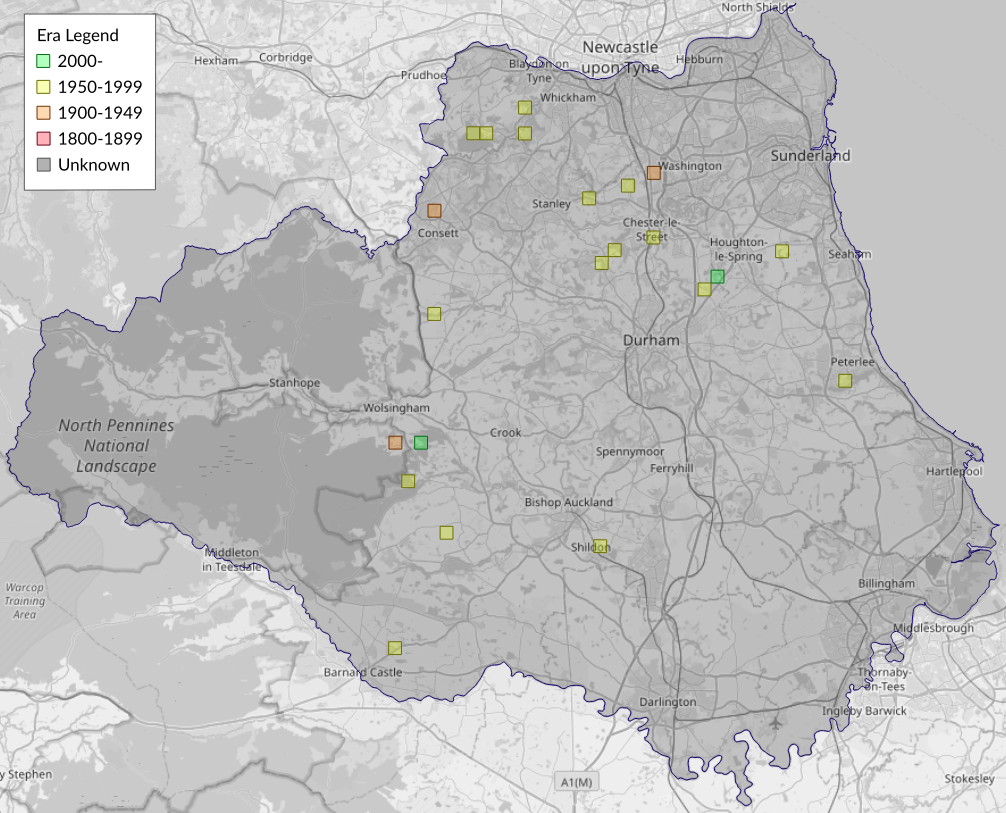 This map shows all records of - Agonopterix assimilella in the Durham (VC66) database per monad (1km grid square). The map can be explored further by zooming and panning, can be reset using the button on the left, and can be filtered by selecting the era. Click on a monad to view a full list of species recorded in it, or its containing hexad (10km grid square).