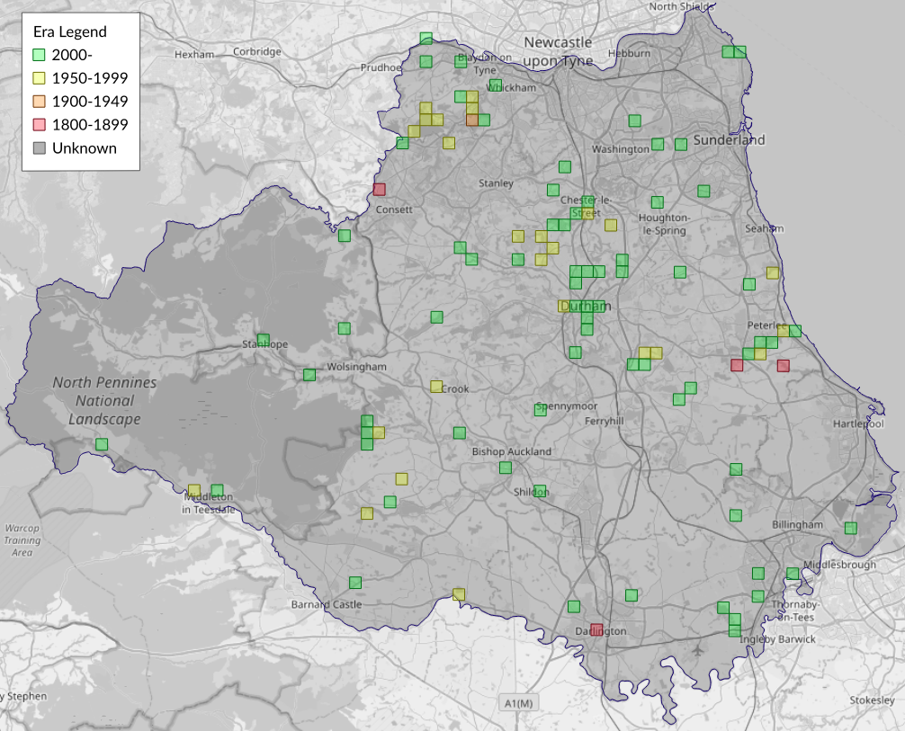 This map shows all records of Peach Blossom - Thyatira batis in the Durham (VC66) database per monad (1km grid square). The map can be explored further by zooming and panning, can be reset using the button on the left, and can be filtered by selecting the era. Click on a monad to view a full list of species recorded in it, or its containing hexad (10km grid square).
