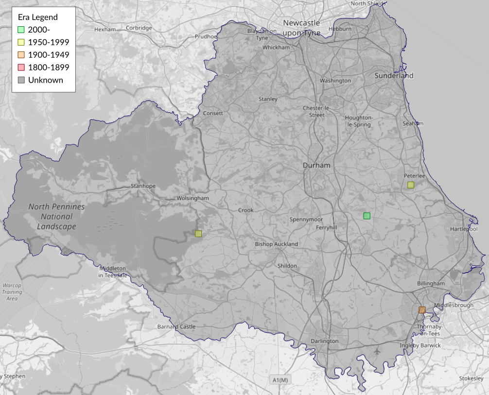 This map shows all records of - Elachista cinereopunctella in the Durham (VC66) database per monad (1km grid square). The map can be explored further by zooming and panning, can be reset using the button on the left, and can be filtered by selecting the era. Click on a monad to view a full list of species recorded in it, or its containing hexad (10km grid square).