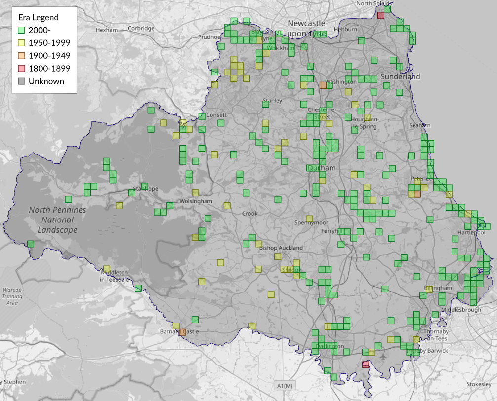 This map shows all records of Yellow Shell - Camptogramma bilineata in the Durham (VC66) database per monad (1km grid square). The map can be explored further by zooming and panning, can be reset using the button on the left, and can be filtered by selecting the era. Click on a monad to view a full list of species recorded in it, or its containing hexad (10km grid square).