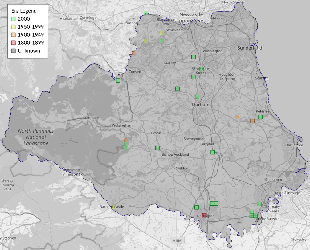 This map shows all records of Ochreous Pug - Eupithecia indigata in the Durham (VC66) database per monad (1km grid square). The map can be explored further by zooming and panning, can be reset using the button on the left, and can be filtered by selecting the era. Click on a monad to view a full list of species recorded in it, or its containing hexad (10km grid square).