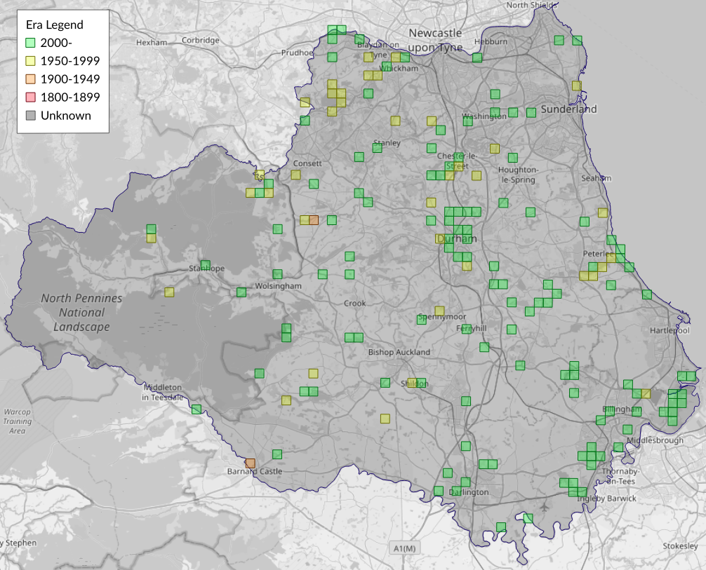 This map shows all records of Clouded Border - Lomaspilis marginata in the Durham (VC66) database per monad (1km grid square). The map can be explored further by zooming and panning, can be reset using the button on the left, and can be filtered by selecting the era. Click on a monad to view a full list of species recorded in it, or its containing hexad (10km grid square).